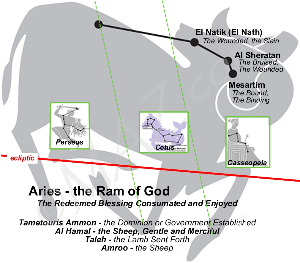 aries Aries (the ram) - He is the Ram of God, redeeming through His sacrificial blood, which was shed as the Passover Lamb.
