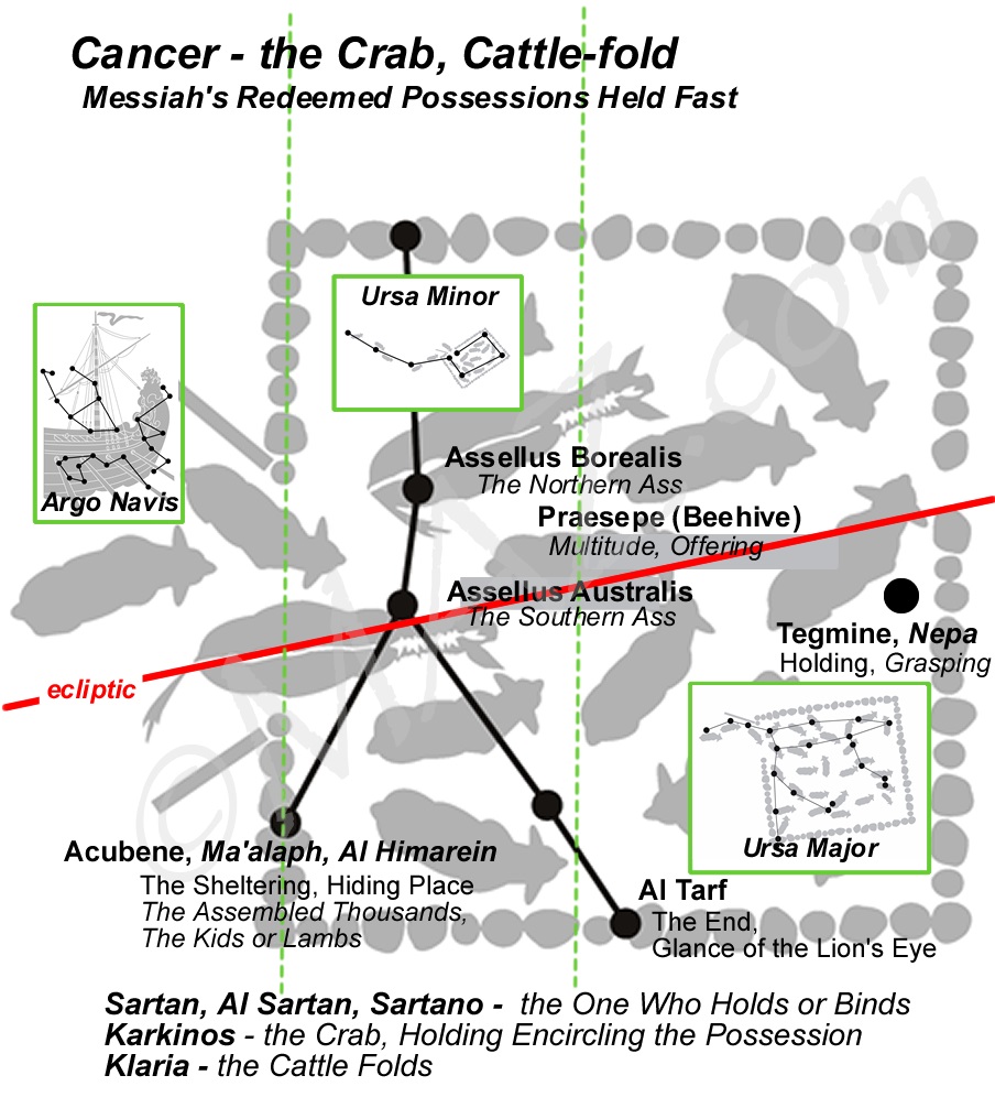 Messiah’s Redeemed Possessions Cancer the crab symbolically shows tenacity to hold on to the faith. This constellation is also symbolized as a sheepfold, which shows Jesus as the Shepherd—the door of the sheep. This indicates a great love for others and a strong pastoral heart of service. This can also show a great heart for pressing into the kingdom of God (Philippians 3:14)—a tenacious pursuer. |