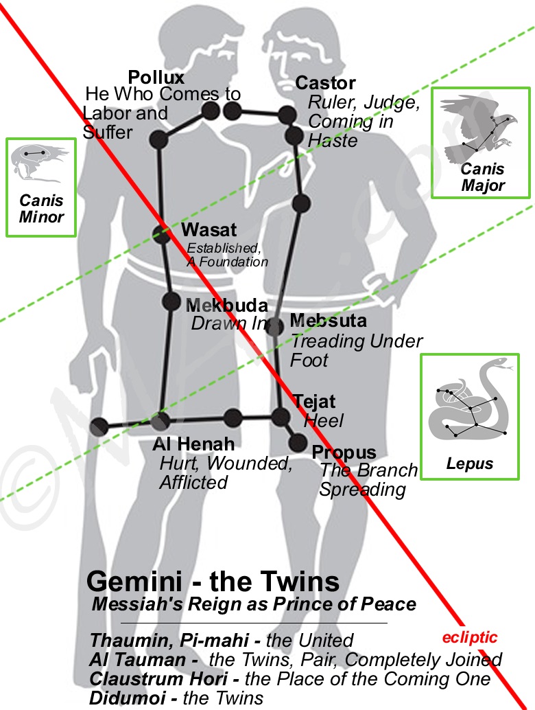 gemini Gemini (the twins) - He is the triumphant Redeemer coming twice, once as a sacrifice and next as the King.
