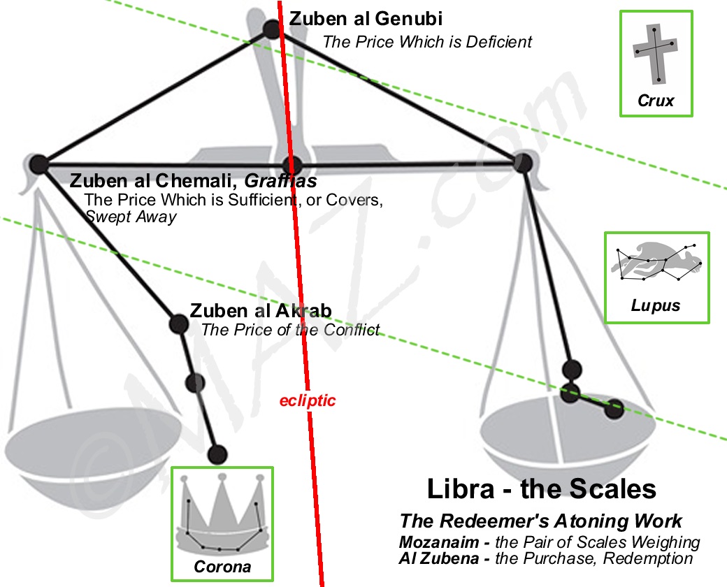 Redeemer’s Atoning Work Libra is the figure of the scales, symbolizing both the redemptive and sacrificial natures of the Messiah (with Christ on one side of the scales and our sins on the other). Libra reveals the character traits of judgment and discernment and may indicate tendencies towards black-and-white judgments with little room for gray. This individual may have a gifting of discernment. |