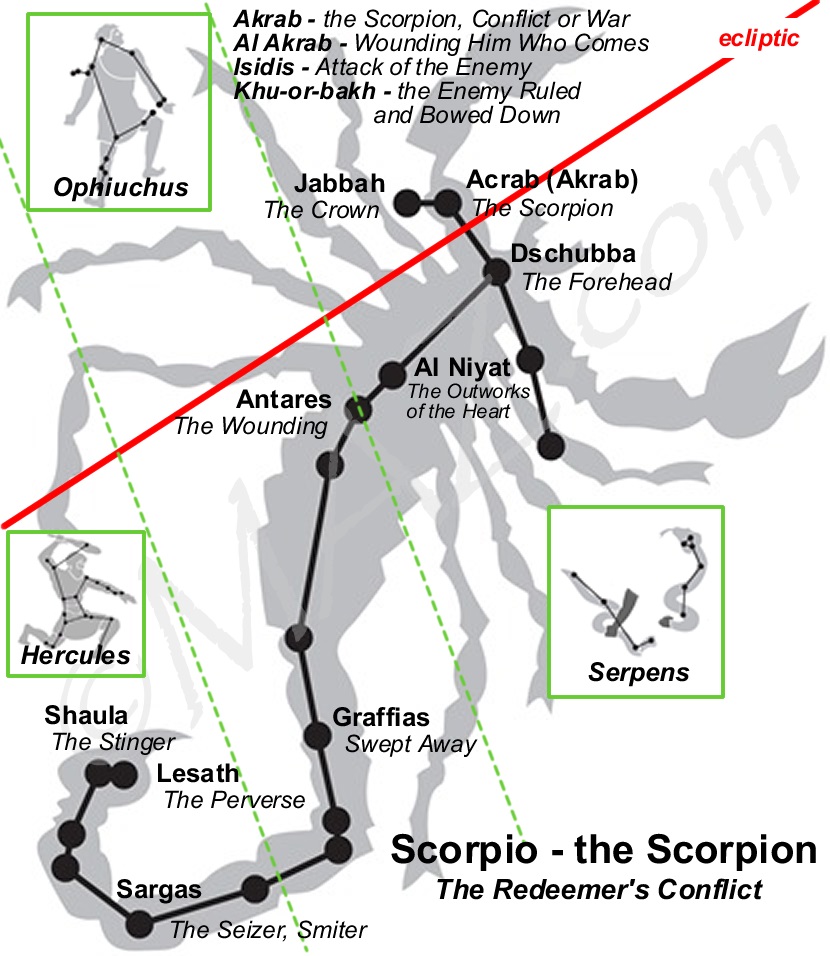 Redeemer’s Conflict Scorpio is the figure of the scorpion with the conqueror’s (Ophiuchus’) foot on its heart. It is the most violent position in the ecliptic path and shows victory through conflict. This shows tenacity, a strong will to win, and being victorious after being wounded, especially since Hercules is included as a decan in this grouping of constellations. It may also reveal a strong prophetic gifting. |